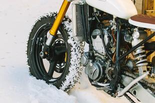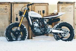 Invece per derapare sul ghiaccio, condizione non così inusuale alle latitudini russe, si sono inventati un ibrido tra flat track e supermotard, la Mr.White su base Yamaha WR250, completamente aggiornata per impianto frenante Tokiko, terminale e sospensioni e ovviamente ruote chiodate.