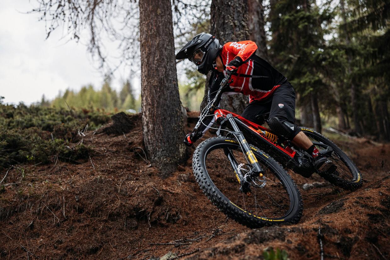 La nuova full carbon di Borgo Panigale punta a sedurre gli appassionati di enduro con un telaio raffinato ricco di dettagli di pregio e con una componentistica di alto livello, come le sospensioni Öhlins, i freni idraulici Braking First e il cambio elettronico wireless Sram GX AXS. Ha ruote differenziate e sistema elettrico Shimano con motore EP801 e batterie da 630 Wh