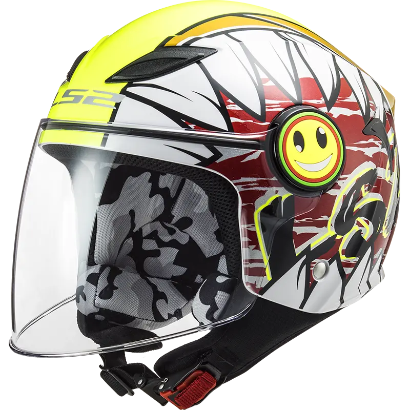 Si parte dal modello OF602 Funny, un jet in policarbonato pensato per l’uso cittadino. Pesa poco, appena 800 grammi, ed è dotato di visiera lunga per tenere completamente al coperto il volto; nei punti di aggancio sorridono due grandi Smile giallo fluo. Sempre per compiacere I ragazzi, l’imbottitura interna è in tinta camouflage e le sei livree disponibili sono molto vivaci, tre monocolore (rosso, rosa oppure bianco) e tre varianti grafiche sgargianti. Il sistema di ventilazione conta su due prese d’aria frontali e due estrattori posteriori, il cinturino ha la chiusura con regolazione micrometrica. Disponibile nelle taglie S, M ed L, costa 69 euro in colorazione unica e 79 euro nella versione grafica.