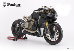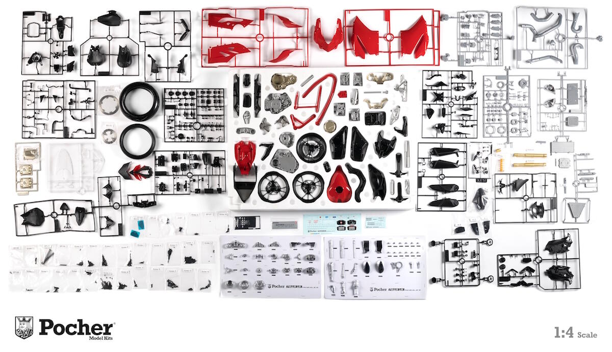 Celebre in tutto il mondo per i modellini ferroviari e automobilistici, Pocher si lancia sulle due ruote e, per realizzare il suo primo modello in scala di una moto la scelta dall’azienda torinese è andata alla Ducati 1299 Panigale S, superbike bolognese da oltre 200 CV. Realizzata in scala 1:4 in metallo pressofuso, materiali plastici e gomma, la “piccola” Panigale S, chiaramente fedelissima in ogni dettaglio all’originale, si compone di 1055 pezzi, la maggior parte dei quali semplicemente da avvitare. Ruote, catene di trasmissione, sospensioni anteriori e posteriori, leve freno e frizione sono tutti funzionati e offrono il livello di dettaglio che da sempre contraddistingua Pocher. Basta dare un’occhiata alle immagini in gallery per rendersene conto… Una volta assemblate tutte le parti, le dimensioni della Ducati 1299 Panigale S sono di 518,7 X 202,5 x 277,5 millimetri e con un peso di ben 5 chilogrammi.