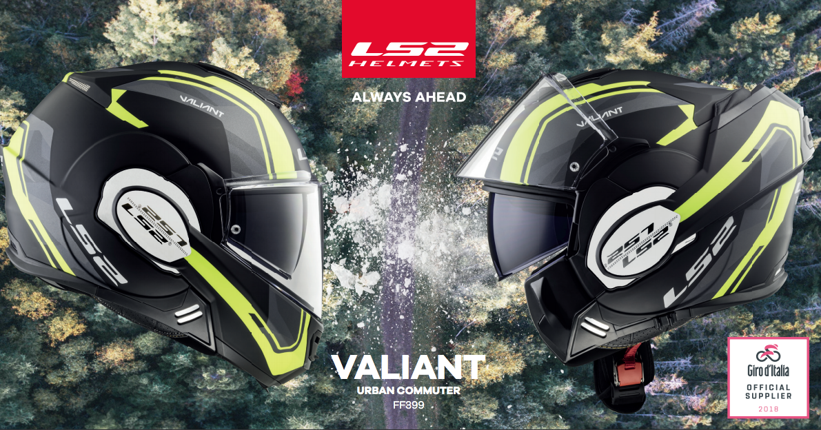 LS2 Helmets è il fornitore ufficiale del Giro d’Italia 2018: i motociclisti che accompagnano i ciclisti durante le 21 tappe della corsa in rosa indossano infatti il Valiant, il modulare della collezione LS2 Urban Commuter. Il casco è caratterizzato da un notevole confort euna buona versatilità, è perfetto per gli spostamenti cittadini ma anche un ottimo compagno di viaggio nei tratti di medio-lungo raggio e in autostrada. La calotta del Valiant è disponibile in tre misure ed è stampata in KPA (Kinetic Polymer Alloy), materiale molto flessibile che rende il casco leggero ed estremamente resistente. La sua forma aerodinamica è progettata per inglobare le prese d’aria superiori e posteriori; innovativo anche il sistema di movimento della mentoniera che, una volta sollevata, prosegue la sua corsa fino alla parte posteriore della calotta. La visiera, antigraffio e anti-UV, è realizzata con tecnologia 3D Optically Correct per evitare le distorsioni ottiche, ed è dotata di Pinlock 70 Max Vision anti-appannamento e della visiera parasole interna TSS (Twin Shield System). Gli interni sono estraibili e lavabili, con tessuti in micro fibra traspiranti e anallergici. Sicurezza e comfort sono assicurati anche dal cinturino in acciaio inforzato, con chiusura a sgancio rapido e regolazione micrometrica. Il Valiant ha la doppia omologazione: si puà usare con visiera sollevata e abbassata ed è disponibile nelle taglie dalla XS alla 4XL. E in occasione del Giro d’Italia 2018 è stato personalizzato in sette colorazioni, selezionate per identificare con rapidità il ruolo dei motociclisti all’interno della carovana: arancio fluo, giallo fluo, blu, grigio titanio, bianco e bianco/rosso.
