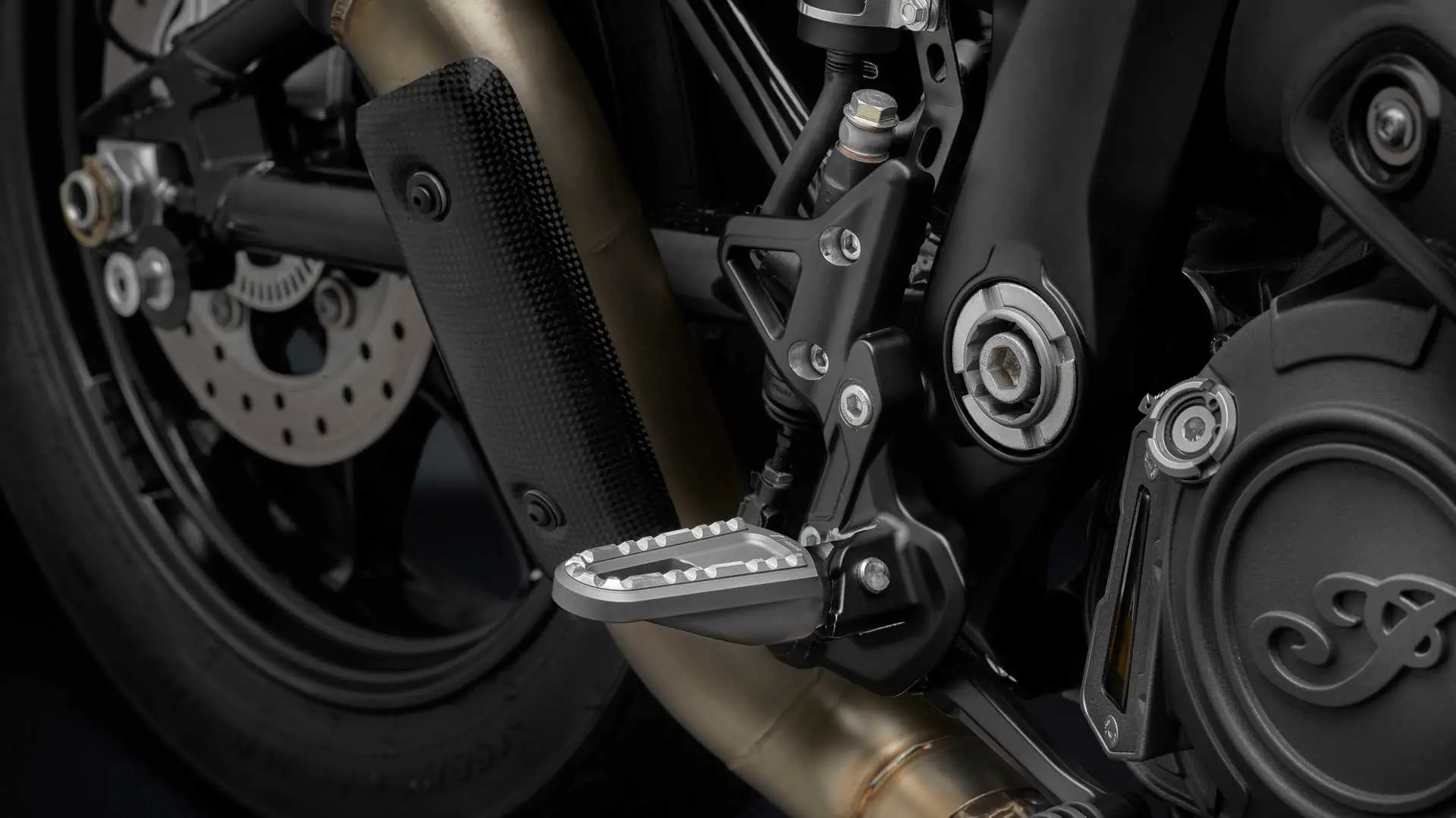 Direttamente ispirata dall’indiscussa campionessa nel Campionato americano di Flat Track Scout FTR750, la FTR 1200, lo ricordiamo, è disponibile in versione “base “ ed “s”: entrambe sono spinte da un nuovo e poderoso bicilindrico a V di 1.203 cm3 raffreddato liquido, in grado di erogare una potenza di 120 CV a 8.250 giri/min, con una coppia massima di 115 Nm a 6.000 giri/min protetto da una preziosa cover in magnesio. A tenerlo a bada ci pensa l’elettronica, con TC, antimpennata e controllo di stabilità più tre mappe motore, cioè Sport, Standard e Rain. Debitamente spogliata delle inutili carenature, sfoggia un prezioso telaio a traliccio in tubi di acciaio abbinato ad un telaietto posteriore in alluminio. A livello sospensioni troviamo una forcella a steli rovesciati da 43 mm con 150 mm di escursione, completamente regolabile per la versione S. La versione base costa 14.90 euro, che salgono a 16.490 per la S.