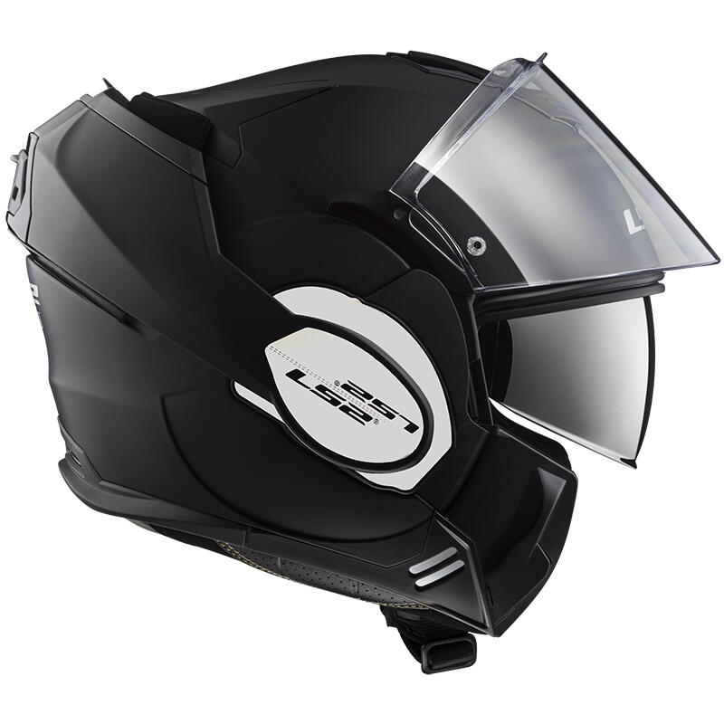 La calotta esterna è realizzata con una forma particolarmente aerodinamica, studiata per inglobare le prese d’aria superiori e posteriori ed il nuovo sistema di movimento della mentoniera. È stampata in due misure in KPA (KinecT Polymer Alloy), esclusiva LS2 che consiste in un misto di polimeri termoplastici e fibra, materiale eccezionalmente leggero e flessibile. Anch’esso brevetto di LS2, il meccanismo di apertura si dimostra invece particolarmente pratico e preciso: la mentoniera si alza premendo un unico tasto al centro della parte inferiore interna e, una volta sollevata, prosegue la sua corsa di 180 ° fino alla parte posteriore della calotta, evitando così fastidiosi effetti vela.