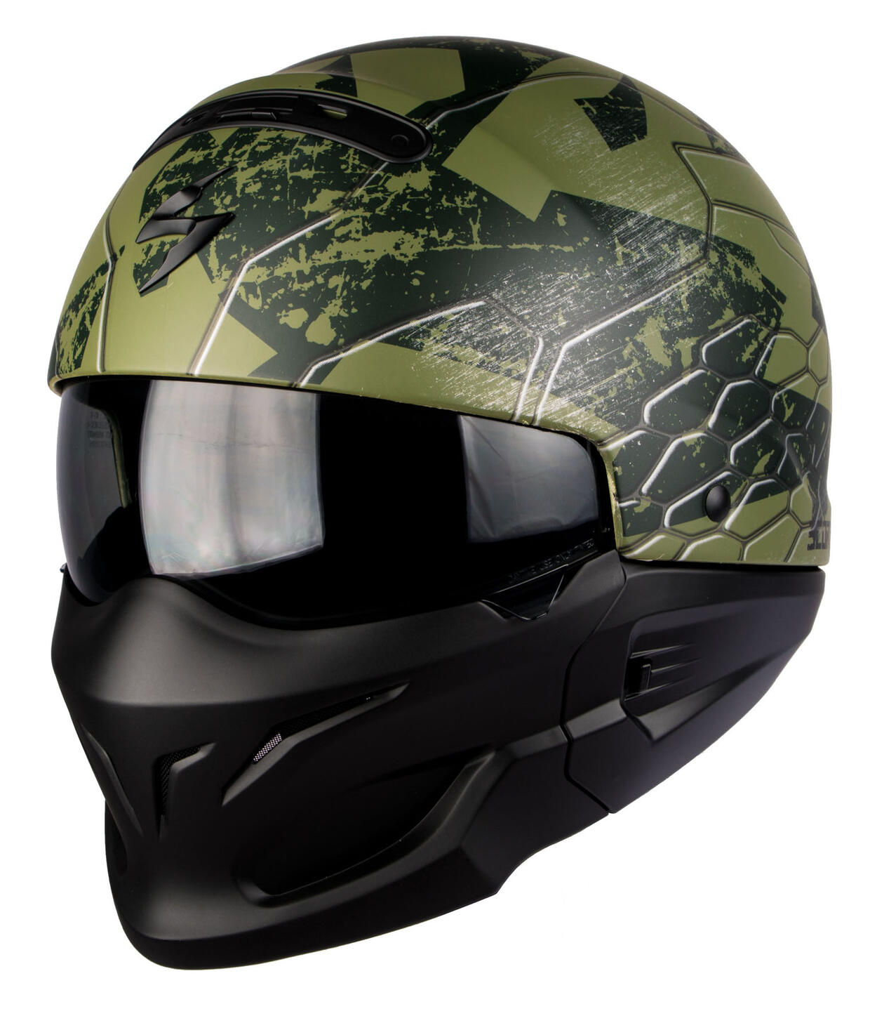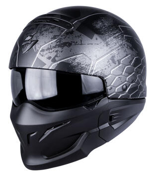 Il nuovo Scorpion Exo Combat, chiaramente ispirato al mondo delle forze armate, propone componenti e particolari tecnici ben studiati nei dettagli. La “base” è quella di un casco JET in policarbonato - quindi parecchio leggero - dotato di una visiera parasole con trattamento “antifog”, al quale è stata aggiunta una mentoniera che può essere tolta o inserita grazie al pratico attacco a “baionetta” magnetico. Gli interni, completamente asportabili e lavabili, sono rivestiti del tessuto KwikWick2®, anallergico, traspirante e confortevole.