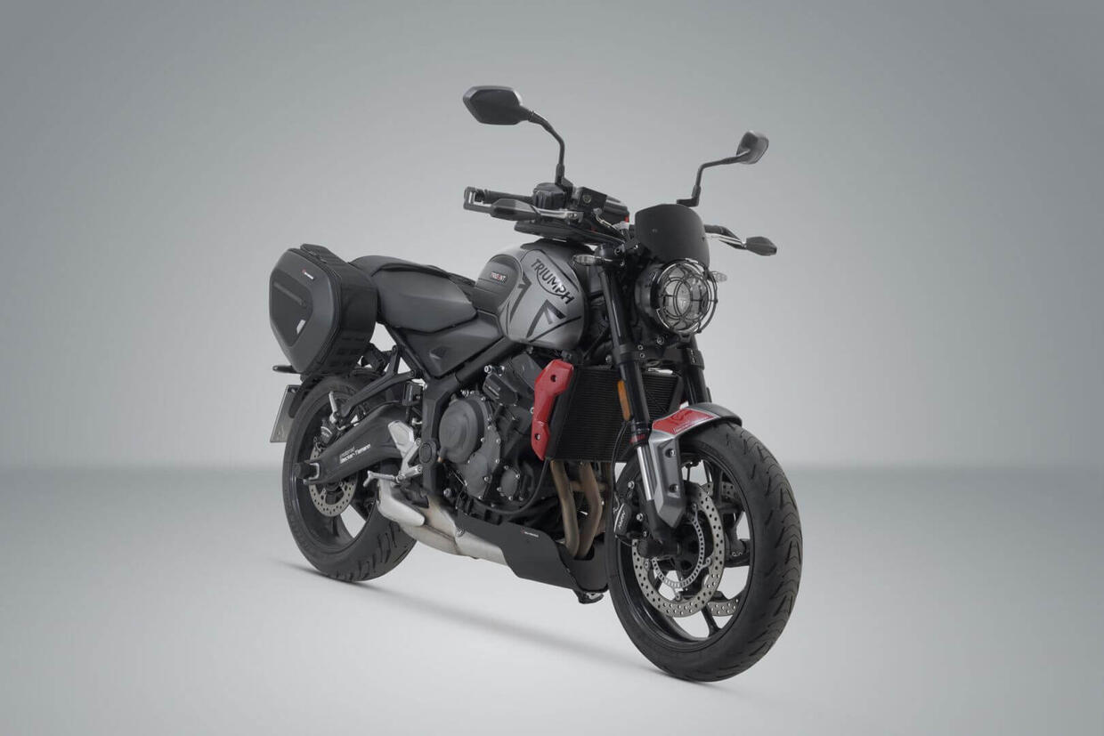 Chi preferisce un aggancio alla moto più solido può montare le borse Legend Legend Gear LC. Il portapacchi rigido è in acciaio verniciato, ha tre punti di attacco e permette l’abbinamento con diverse borse prodotte da SW-Motech: Legend Gear LC1 e LC2 in materiale canvas cerato per un look retrò, da 13,5 o 9,8 litri ognuna a seconda del modello; Urban ABS in plastica ABS leggera e robusta; le nuove borse SysBag WP nelle misure S e M si adattano bene anche alla Trident 660.
