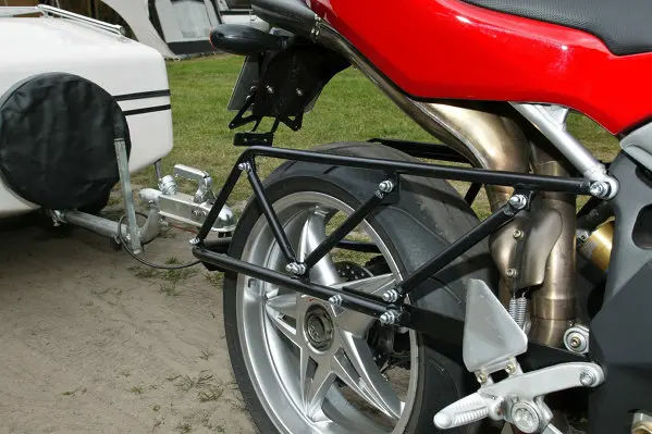 Andare in vacanza con una sportiva non è facile, a parte lo scarso comfort, il difficile arriva quando bisogna caricare i bagagli. Se tutto va bene si possono montare borsa da serbatoio e sacca da sella, troppo poco per pensare di andarci in vacanza, magari in due. La Shuring, un'azienda olandese con sede nei pressi del circuito di Assen (sarà un caso?), ha risolto brillantemente il problema, con una gamma di carrelli tenda e portabagagli da moto. Si collegano al telaio (foto sotto) della moto, lasciando libera la sospensione posteriore. Le versioni disponibili sono tante, quello in foto, abbinata alla MV, è la Campmaster un carrello tenda disponibile in 2, 3 e 5 posti letto. Se siete interessati qui c'è il sito ufficiale, ma attenzione: questi carrelli non sono omologati in Italia.
