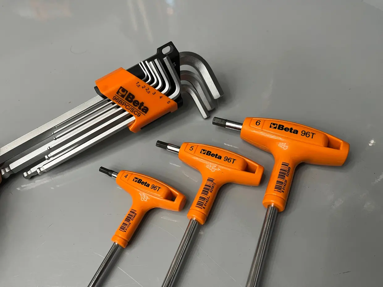 Molte viti della nostra moto hanno la testa esagonale "femmina", quindi incassata, e l'unico modo per svitarle è usare la classica brugola: le misure più utilizzate sono la 4, la 5 e la 6, rispettivamente la distanza in millimetri tra i lati opposti e paralleli dell'esagono. Sarebbe ideale avere queste tre misure con l'utensile dotato di impugnatura, che permette di stringere o svitare con più forza la vite. In alternativa ci sono set più compatti e più completi che prevedono misure dalla 1,5 alla 10: difficilmente con tutte queste misure "in tasca" avrete problemi a smontare una moto.