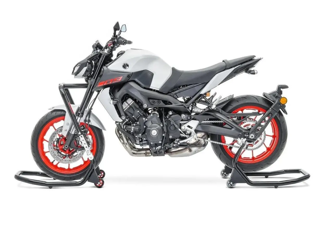 Anche con gli pneumatici gonfi, lasciare la moto per mesi sul cavalletto laterale resta un compromesso. Il centrale è sicuramente meglio, ma non tutte le moto lo hanno. Chi vuole azzerare i carichi sulle gomme può ricorrere ai cavalletti da officina per forcellone e forcella (qui sotto li vedete). In questo modo le ruote restano completamente scariche: un vantaggio anche durante le manutenzioni più importanti. L’unico limite è che così gli ammortizzatori restano sotto carico. Per eliminarlo, serve un cavalletto centrale al telaio, specifico per modello e decisamente più costoso, che solleva la moto vicino al perno forcellone, scaricando sia le gomme che le sospensioni.