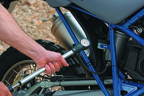 Con la pompa fornita da BMW si regolava l’assetto della HP2, tenendo d’occhio la “livella a bolla” nel telaio