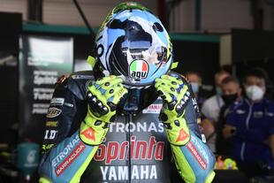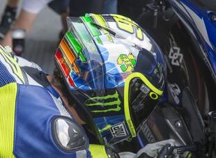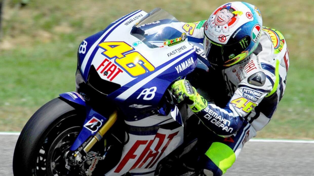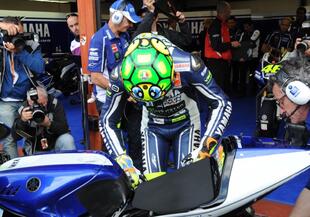 Nel 2010 Rossi ha un avvio di stagione non facilissimo: dopo il successo in Qatar, Lorenzo ne vince due di fila e a Vale serve un jolly. Il joker (qui sopra) viene messo sul casco, ma la risata di Rossi sarà amara, dopo l'incidente con frattura di tibia e perone nelle libere del venerdì che comprometterà la stagione.