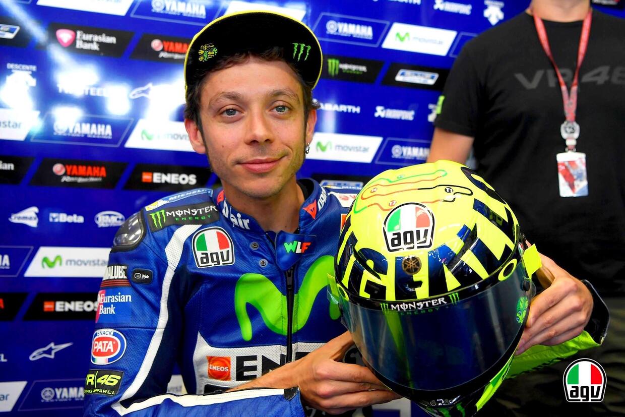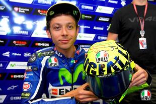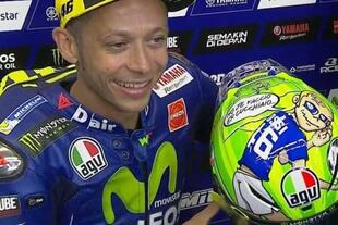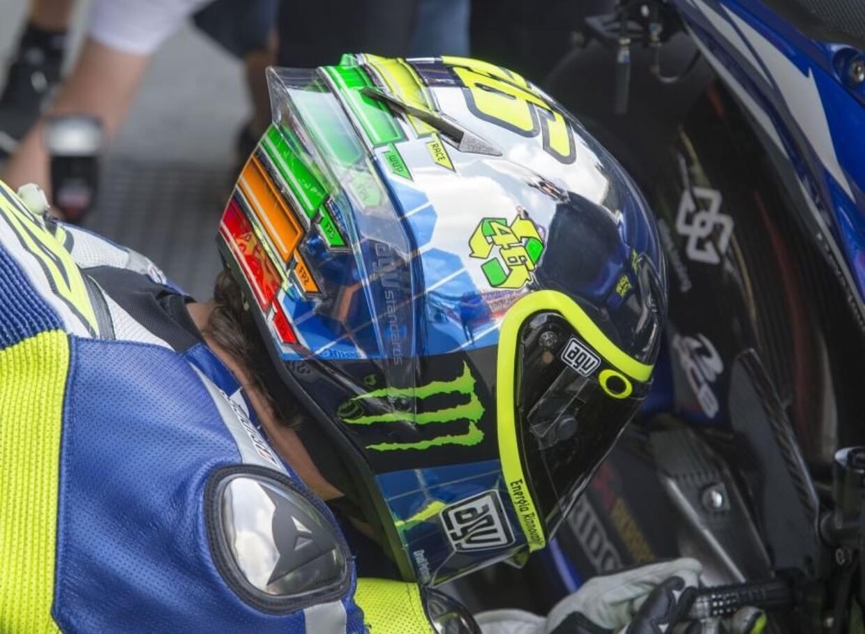 Nel 2013 Rossi scherza sulla sua presunta "lentezza": sul casco compare una tartaruga (qui sopra) e anche l'anno successivo c'è voglia di ridere sul tema "bolliti". Il casco (qui sotto) è ricoperto di pasta "prodotta a Tavullia, prodotto certificato, non scuoce mai".