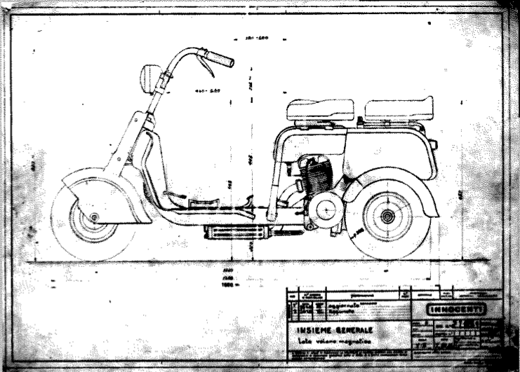E così, il 2 settembre 1944 iniziano ufficialmente i lavori. Non c’è uno stabilimento dedicato: si lavora al piano terra della palazzina romana di via Necchi Bianca, messa a disposizione dall’imprenditore. L’idea iniziale è quella di un ciclomotore da 100/125 cm3, semplice, economico e costruibile con facilità, dotato di telaio a trave. Vengono preparate tavole e schizzi che convincono Innocenti a dare il via libera. Fin da subito emerge un elemento che caratterizzerà tutta la storia del progetto: il controllo diretto dell’imprenditore. Innocenti segue il lavoro quotidianamente, interviene sui disegni, chiede linee sobrie e grande cura del dettaglio, anche a costo di aumentare il prezzo finale. Ogni particolare viene studiato, modificato, rifatto più volte prima di essere approvato. La prima impostazione tecnica prevede un motore di concezione tradizionale, derivato da unità tipo Villiers, con trasmissione a catena e raffreddamento ad aria naturale. Ma siamo solo alle battute iniziali.