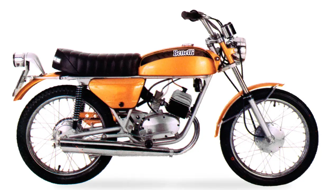 Benelli aveva già provato, prima dell’arrivo di De Tomaso, ad entrare nel mercato off-road con modelli come il Trial 49 e lo Sprint 5V presentati al Salone di Milano del 1969. Due moto con caratteristiche tecniche interessanti, quali ad esempio l’accensione elettronica, la testata radiale, il cambio a 5 marce, la forcella teleidraulica e la ruota anteriore da 19”, ma stoppate dalle difficoltà aziendali a cui accennavamo poco più sopra. Nel 1971, il Salone di Milano vede la rinascita con una nuova gamma off-road, la Scrambler e la Turismo. Entrambe si basano sui modelli del ’69, aggiornati esteticamente e tecnicamente. La Scrambler, con telaio a doppia culla, forcella Marzocchi e colori vivaci, conquista il pubblico giovane, mentre la Turismo si rivolge a chi cerca comodità e stile più sobrio, con una posizione di guida rilassata e serbatoio bicolore. Parallelamente nasce anche la Cross 125, moto da fuoristrada più “seria” rispetto alle piccole 50 cm3, pensata per chi desidera una moto da regolarità e non solo un giocattolo per il weekend.