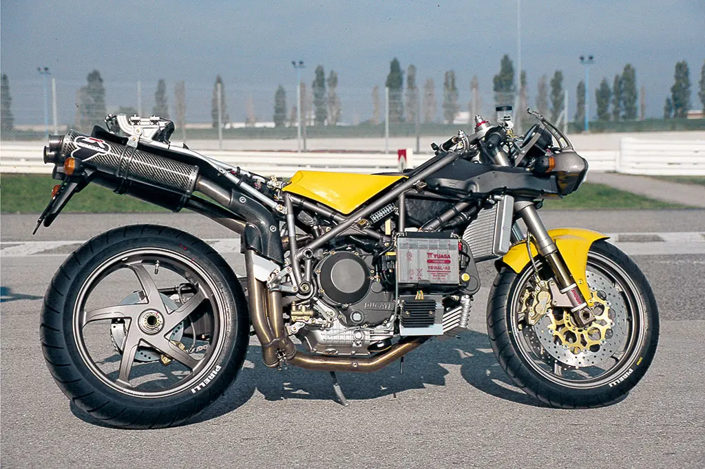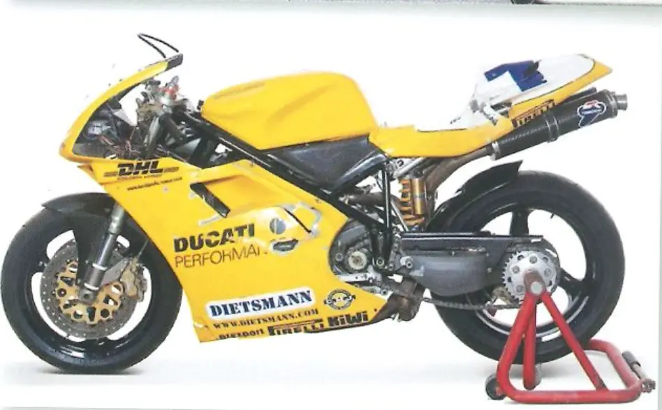 Motore da 104 CV con bielle in titanio, telaio alleggerito (tubi 1,5 mm), telaietto posteriore in alluminio, tubi freno e frizione trecciati, codone monoposto con tabella, mono Ohlins, colore giallo. Prezzo: 29.000.000 lire.