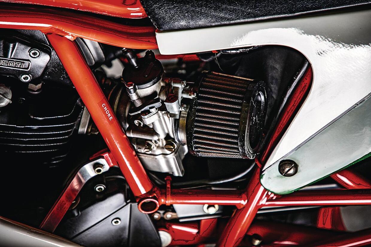 La base tecnica derivava dalla 650 Pantah, con corsa però portata a 61,5 mm e alesaggio a 88 mm, per una cilindrata di 748 cm³. I numeri sono incerti: mentre Ducati dichiarava una potenza di 70 CV a 9.000 giri, le rilevazioni dell’epoca indicavano valori più realistici attorno ai 62,5 CV a 7.500 giri. In un caso o nell’altro, l’alimentazione era affidata a carburatori Dell’Orto PHF da 36 mm, montati senza airbox: una scelta estrema, figlia diretta della derivazione racing, che contribuiva al carattere ruvido del motore. Ovviamente, anche la velocità massima variava a seconda delle fonti e delle condizioni, collocandosi tra i 200-206 km/h reali e i circa 220 km/h dichiarati.