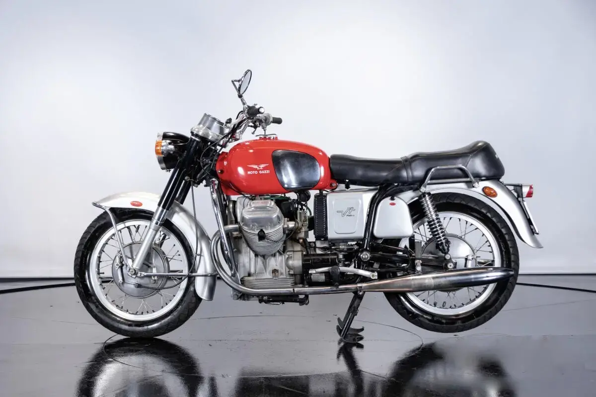 La cilindrata è di 748,4 cm³, sempre con schema a V di 90° e distribuzione ad aste e bilancieri e l’alimentazione è affidata a due carburatori Dell’Orto, per una potenza dichiarata di 72 CV a 7.000 giri/min. Il dato interessante non è soltanto il valore assoluto, ma il modo in cui questa potenza viene ottenuta: senza stravolgere la natura del progetto originale, ma lavorando su affinamenti progressivi di alimentazione e regime di rotazione. È un’evoluzione che rimane coerente con l’impostazione iniziale: privilegiare una curva di erogazione utilizzabile, più che numeri estremi. Grazie, anche, la particolarissimo telaio (quello che nelle pre-serie era dipinto in rosso), la V7 Sport di Tonti riscosse un enorme successo e, solo nei primi tre anni di produzione, interrottasi agli inizi del ’75, furono venduti ben 3.541 esemplari, oltre ai 150 della pre-serie.