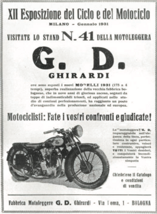 Dalla crisi della SIRIE nasce la G.D.: Guido Dall’Oglio e Gherardo Ghirardi brevettano un motore a due tempi che attira l’attenzione degli addetti ai lavori, e poco dopo viene presentata una moto con il marchio G.D., ancora prima della fondazione ufficiale dell’azienda, avvenuta il 1° febbraio 1924. La nuova impresa parte come attività dell’avvocato Mario Ghirardi: le iniziali del marchio – Ghirardi & Dall’Oglio – indicano una collaborazione legata al brevetto più che una società strutturata. Alla fine del 1925 Dall’Oglio e Gherardo Ghirardi lasciano l’azienda, e Mario Ghirardi resta l’unico referente. Dal 1926 il marchio diventa semplicemente G.D. – Ghirardi.