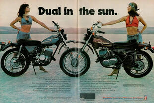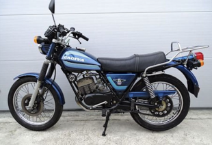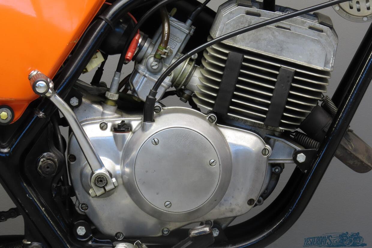 Completamente nuovo anche il telaio. Il precedente schema monotrave viene sostituito da una struttura a doppia culla in tubi, con una trave centrale di sezione quadrangolare che funge anche da serbatoio dell’olio. Al telaio vengono abbinati ammortizzatori idraulici regolabili su cinque posizioni di molla ed un comparto frenante affidato ad un tamburo in lega leggera da 140 mm davanti e dietro. Il tutto per un peso a vuoto 114 kg. Dal punto di vista stilistico emergono richiami evidenti alle scrambler giapponesi dell’epoca, ma il progetto viene personalizzato attraverso elementi come il serbatoio a goccia, i parafanghi alti - con quello anteriore alto - e la marmitta rialzata e schiacciata sul lato sinistro.