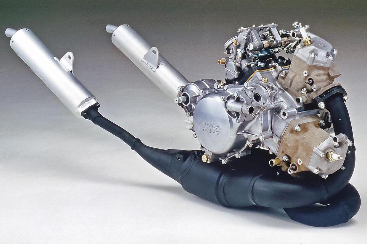 Il motore, sigla MC16E, era un V2 due tempi raffreddato a liquido a 90°, completamente diverso da quello della precedente NS250R/F e concettualmente vicino alla RS250R che sarebbe arrivata nel 1987. Honda lavorò per mantenere una risposta brillante ai medi regimi, una potenza elevata e quel tipo di vibrazioni “emotive” tipiche delle due tempi, migliorando allo stesso tempo l’erogazione, i consumi di carburante e olio e la facilità di manutenzione. Con alesaggio e corsa di 54 x 54,5 mm, il bicilindrico da 249,6 cm³ dichiarava 45 CV a 9.500 giri e una coppia massima di 3,6 kgm a 8.500 giri. Non mancavano soluzioni raffinate per l’epoca: cilindri senza camicia con trattamento superficiale, pompa dell’olio a controllo elettronico e la già citata RC Valve, capace di variare la fasatura dello scarico in base al regime di rotazione.