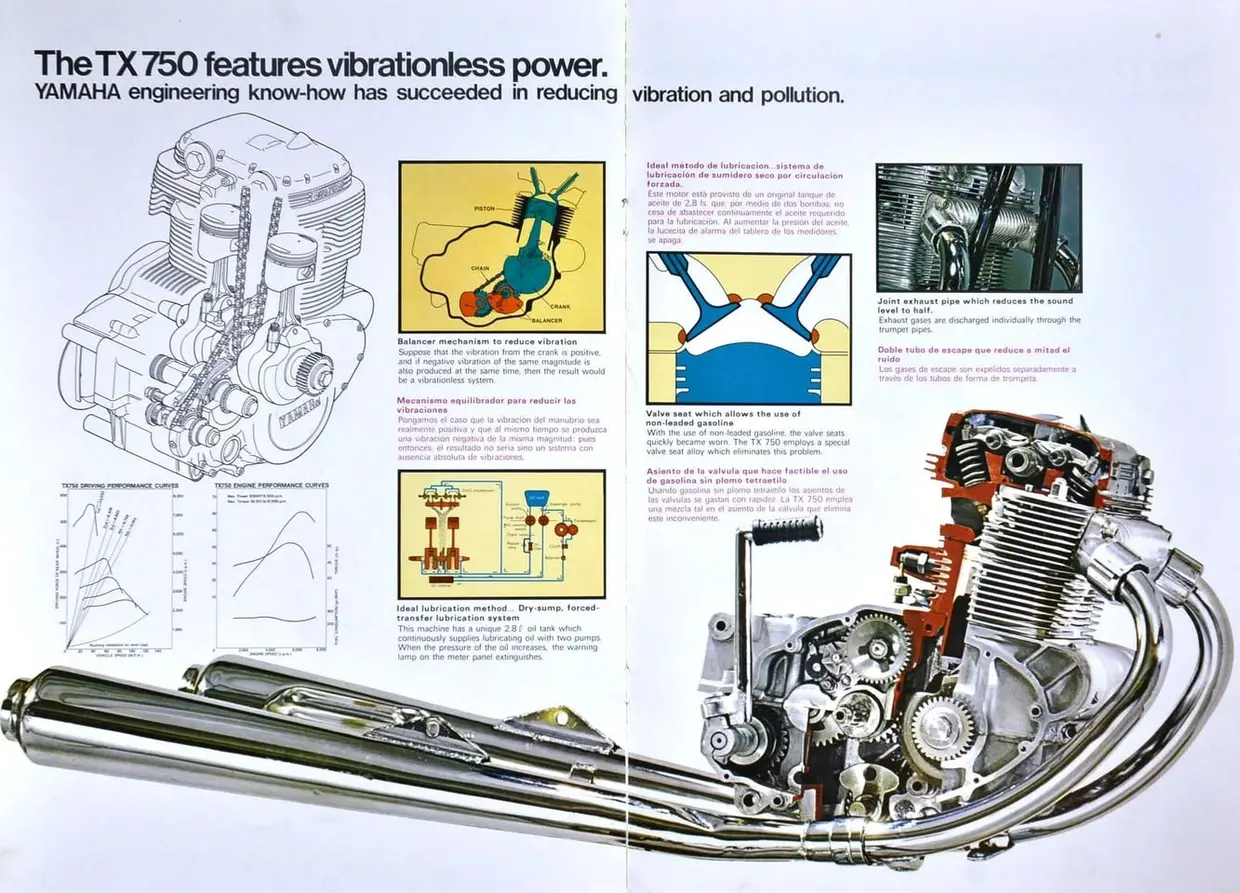 Il cuore della TX 750 era un bicilindrico parallelo di 743 cm³ inclinato in avanti, raffreddato ad aria, monoalbero a catena e con distribuzione a due valvole per cilindro. Alimentato da due carburatori Mikuni da 38 mm, erogava 63 CV a 7.500 giri/min e una coppia di 7 kgm a 6.000 giri. La vera innovazione era il sistema Omni-Phase Balancer, con due contralberi mossi a catena progettati per eliminare le vibrazioni tipiche dei bicilindrici paralleli. Il risultato, come scrissero diverse riviste, fu una fluidità mai vista su un twin: Cycle World parlò di “morbidezza incredibile”, mentre Cycle lo definì “il motore bicilindrico più avanzato nel mondo delle moto”. Ma dietro a tanta raffinatezza si nascondeva un errore fatale.
