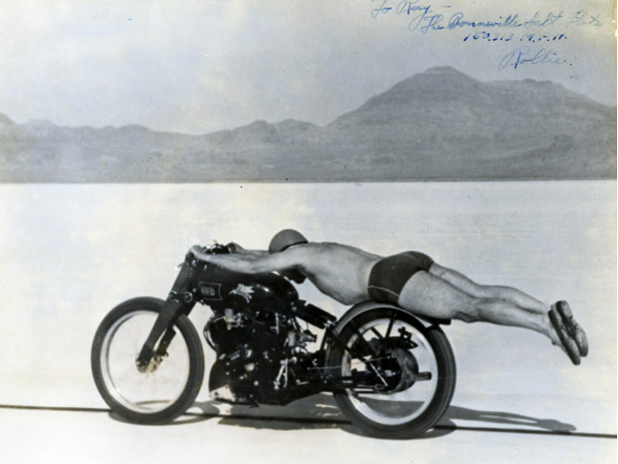 L’immagine è particolarmente d’attualità visto il caldo di questi giorni, ma in realtà risale al 1948 e il fatto che il pilota sia seminudo non è per rinfrescarsi ma il tentativo di ridurre la resistenza aerodinamica. Si tratta della fotografia più famosa di una moto del marchio britannico Vincent: alla guida di una Black Lightning, lungo disteso con la pancia appoggiata al parafango posteriore e le gambe allungate all’indietro, pudicamente vestito solo di un paio di pantaloncini, casco in testa e ai piedi un paio di scarpe da tennis, c’è Roland ”Rollie” Free. È impegnato nel tentativo di stabilire il record nazionale di velocità su terra degli Stati Uniti, e il curioso ”abbigliamento“, se così lo vogliamo chiamare, evita lo svolazzare di qualsiasi indumento. Quella posizione era usata anche da altri piloti se Free aveva effettuato i primi tentativi con un abbigliamento in pelle tradizionale, che però a 237 km/h si era strappato per la pressione dell’aria. Di qui la drastica decisione di fare un ultimo tentativo senza niente addosso.