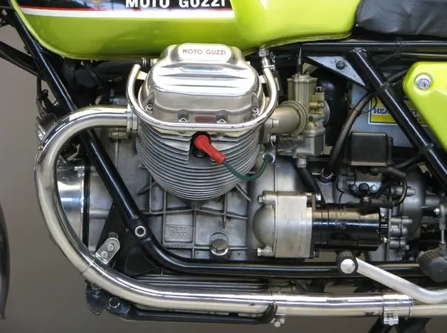 Il cuore della V7 Sport era il bicilindrico a V di 90°, 748,4 cm³, con valvole in testa e distribuzione ad aste e bilancieri. Alimentata da due carburatori Dell’Orto VHB30, erogava 72 CV SAE a 7.000 giri/min. Numeri che si traducevano in una velocità massima di ben 208 km/h, con accelerazioni e prestazioni paragonabili ai migliori modelli giapponesi dell’epoca (leggasi Honda 750 Four e Kawasaki 750). Il cambio era a 5 rapporti, comando a leva singola sulla destra (con la 1à in alto) e trasmissione finale ad albero cardanico.