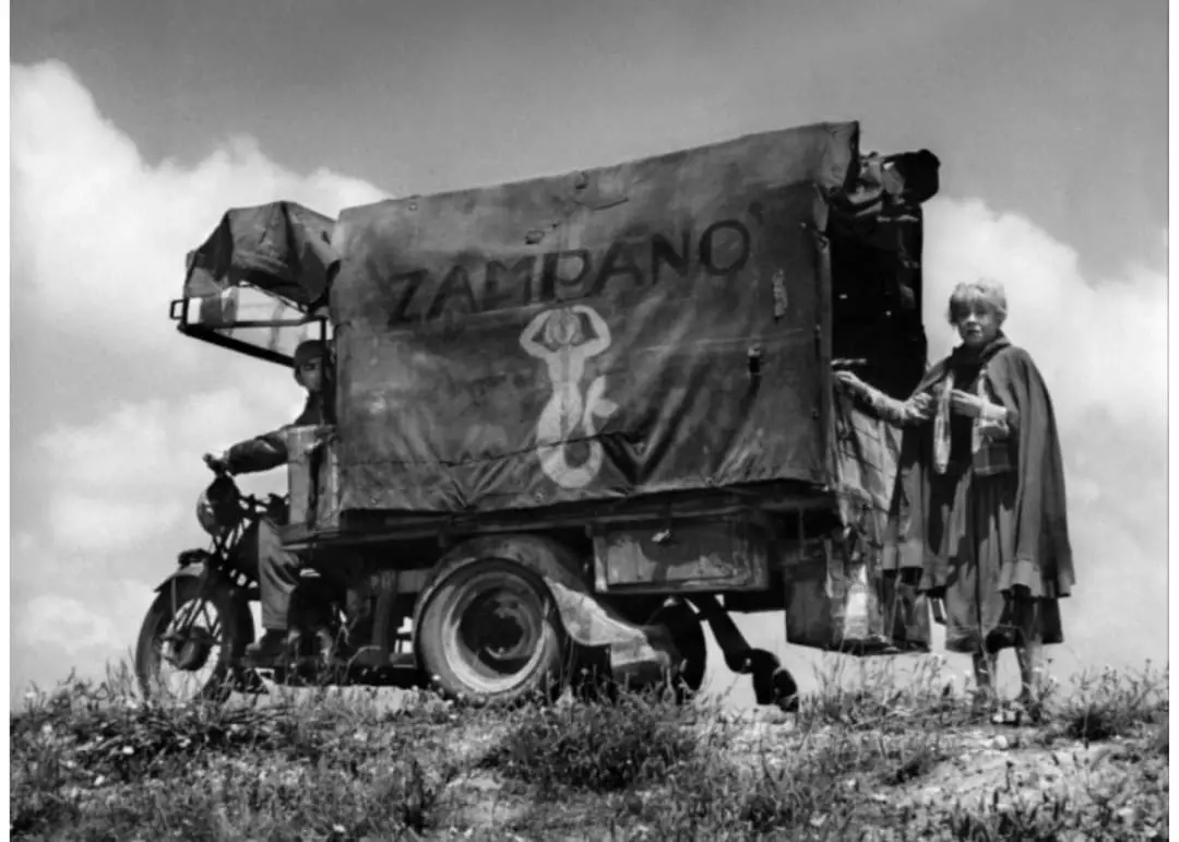 ConFederico Fellini, il motocarro assurge alle vette dell’arte. Gelsomina e Zampanò, gli indimenticabili protagonisti del film "La Strada" (Oscar come miglior film straniero nel 1957), vivono infatti la loro poetica e misera vita a bordo di uno scalcinato motocarro, che funge da casa e da palcoscenico. Dal film venne anche ricavato nel 1966 un balletto interpretato da Carla Fracci, Aldo Santambrogio e Mario Pistoni, con le musiche di Nino Rota, che porterà un motocarro – in questa occasione un Guzzi Ercole – a calcare addirittura il palcoscenico del Teatro Alla Scala. Nel film (qui sopra), invece, la “parte” era interpretata da un ibrido artigianale con motore Astra. Nella foto Piccagliani della rappresentazione scaligera, l’addio di Gelsomina alla madre prima di avviarsi con Zampanò.