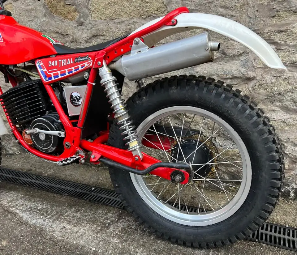 Esteticamente, la 240 era una moto d’impatto: le plastiche rosse di serbatoio e fianchetti spiccavano sul nero del motore e sui parafanghi bianchi. I cerchi lucidi completavano un pacchetto visivamente ben equilibrato. L’unica nota stonata era forse il grosso faro anteriore, pensato per l’omologazione stradale più che per il trial puro.