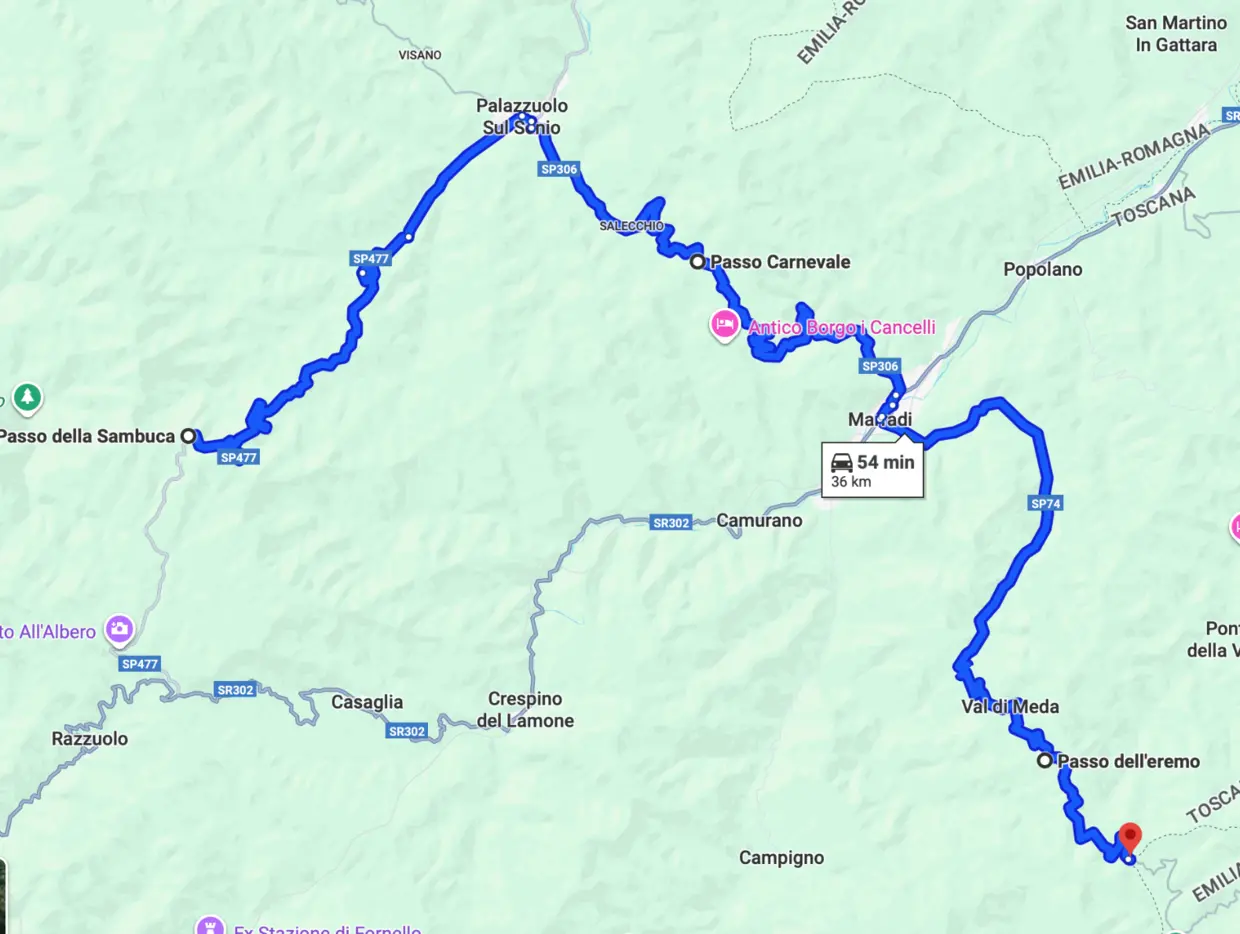 Giunti alla Sambuca, ci prepariamo per al terza ed ultima trance del nostro giro sull’Appennino. Altri 35 km così suddivisi: dalla Sambuca si prosegue lungo la 477 in direzione Palazzuolo sul Senio, imboccando poi la SP 306 verso Salecchio fino a Passo Carnevale. La 306 prosegue poi fino a Marradi, da cui si prende la SP74 verso la Val di Meda fino al Passo dell’Eremo e, poco più in giù, quello della Peschiera.