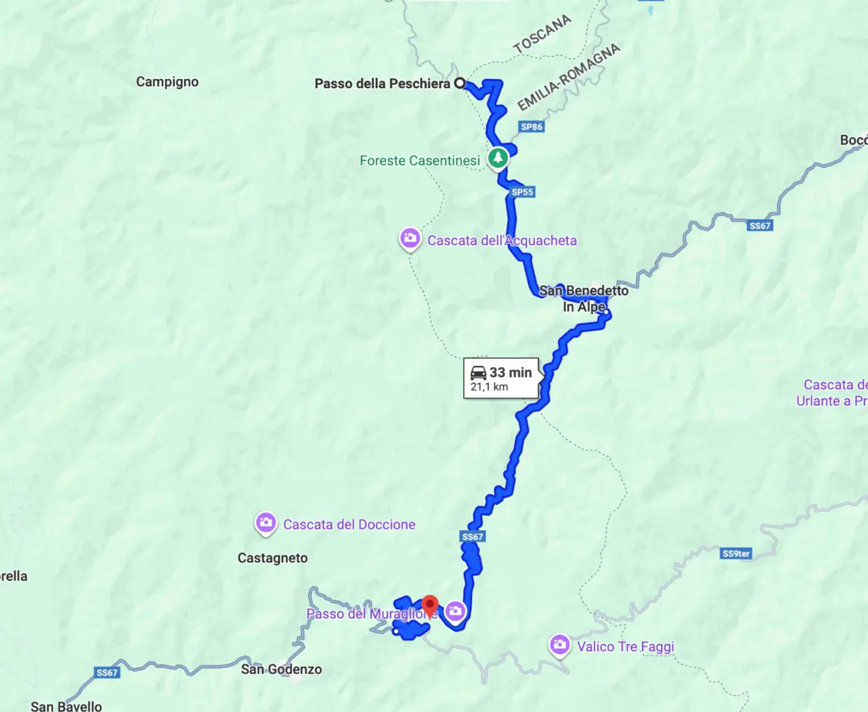 A questo punto, non resta che raggiungere ed affrontare il Muraglione (qui ve ne parlavamo nel dettaglio). Dalla Peschiera seguiamo la Provinciale 55 e la SS67 per circa 20 km ed una miriade di curve. Raggiunto il Muraglione si può rientrare verso Firenze (le curve più impegnative ce le siamo ormai lasciate alle spalle e la strada corre abbastanza veloce per una cinquantina di km circa), oppure, a seconda dei casi, risalire verso Forlì lungo la più panoramica SS 67.