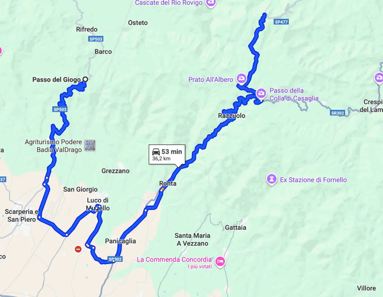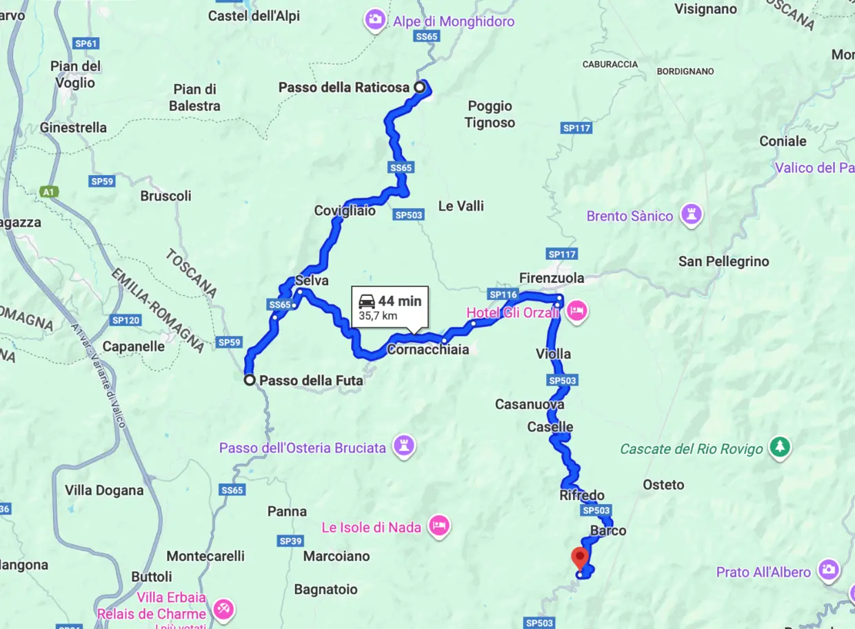 Seguendo il nostro itinerario, si potrebbe partire dal Passo della Raticosa e, da lì, rimanendo in zona Firenzuola, proseguire fino al Passo del Giogo, superando quello della Futa. Totale meno di 40 km da percorrere lungo la SS65 dal Passo della Raticosa a quello della Futa e, da lì, imboccare la SP116 (che poi diventa 503) in direzione Barco fino al Passo del Giogo.
