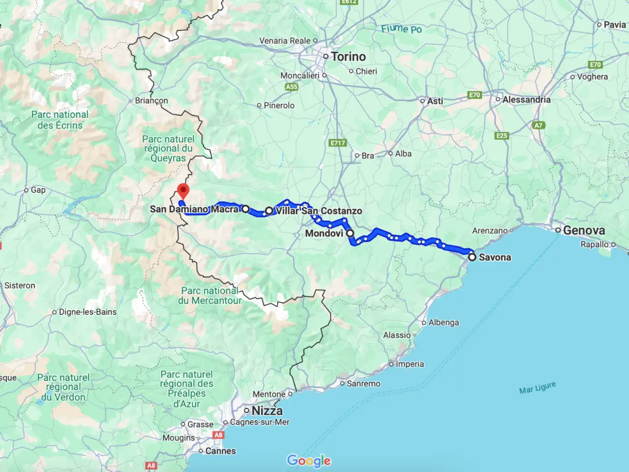 - Savona - Mondovì tramite E717 (circa 100 km);