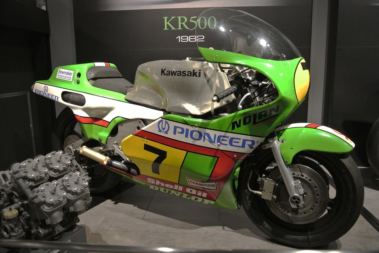 Altri costruttori usarono con minor fortuna motori quattro cilindri in quadrato nel mondiale 500 GP: nel 1979 la Kawasaki con la sua KR 500 (qui sotto), che corse fino al 1982 ma senza ottenere grandi risultati.