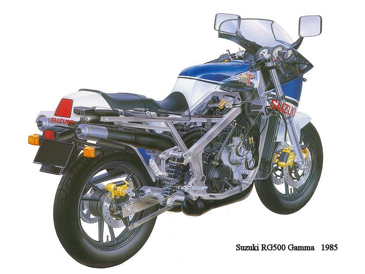 Il motore quattro cilindri in quadrato a dischi rotanti tornò nel 1985, ma su un modello stradale, quando in risposta alla Yamaha RD 500 – che però aveva i cilindri a V e l’ammissione lamellare – la Suzuki lanciò la RG 500 Gamma, che aveva molte soluzioni costruttive analoghe a quelle delle sue vecchie moto da Gran Premio. Alesaggio e corsa erano 56 × 50,5 mm e la potenza era di 95 CV a 10.000 giri/minuto, per l’epoca decisamente rilevante.