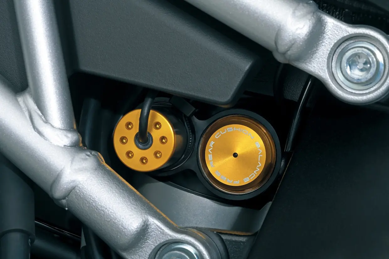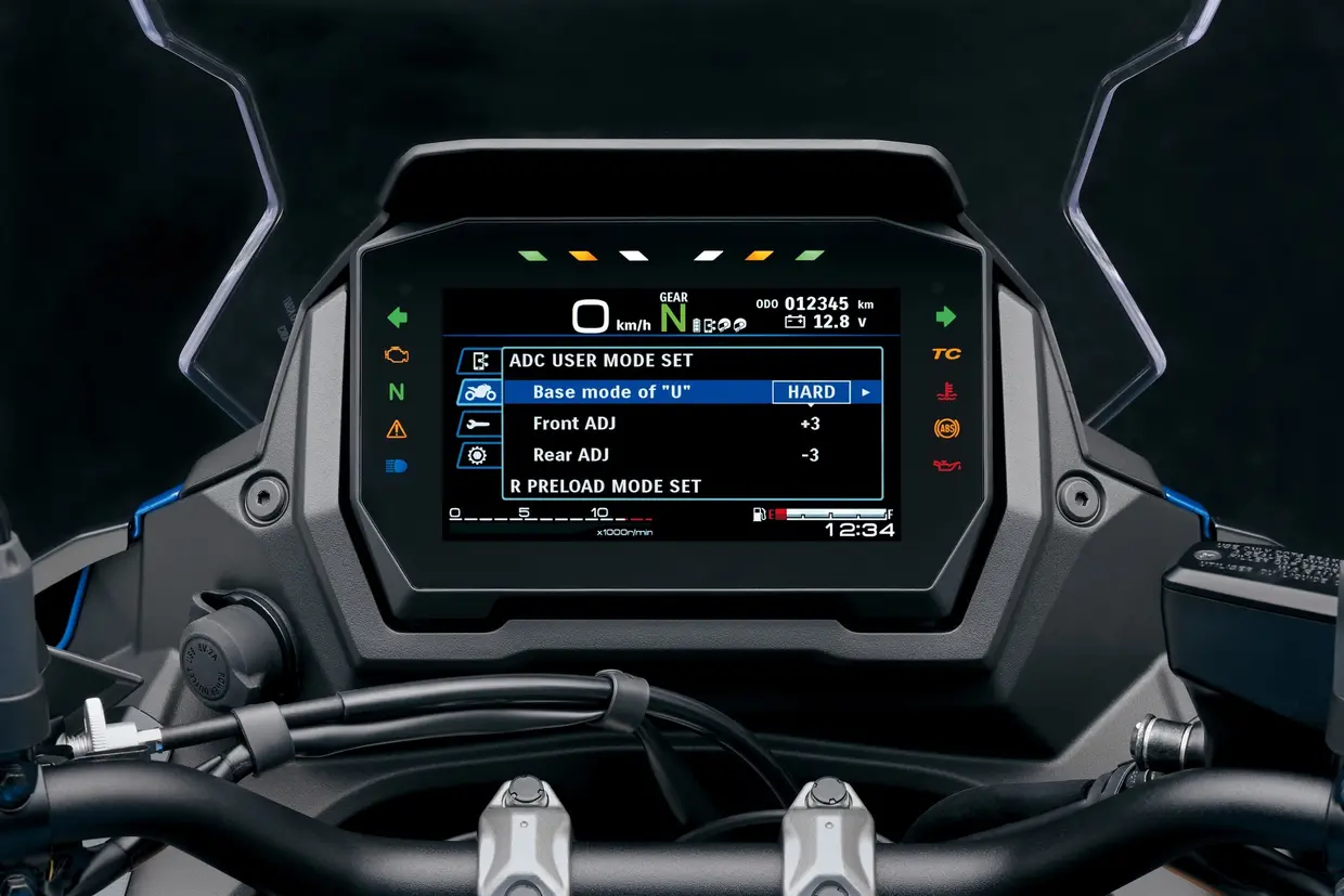 Su una sospensione elettronica, invece, sono presenti degli attuatori elettromeccanici che si occupano di fare tutto il lavoro per voi. Questi componenti non si vedono, sono nascosti internamente alla forcella e al monoammortizzatore: infatti l'unico indizio che ci fa capire della loro presenza sono i relativi cavi di connessione che spuntano dai tappi della sospensioni al posto dei classici registri. Cambiando mappa o modificando i setting direttamente dal cruscotto, in pochi millisecondi il sistema è in grado di riadattare la taratura di forcella e monoammortizzatore secondo quanto richiesto dal pilota, anche in marcia. Esempio: di rientro da un bel giro venite sorpresi da un diluvio inaspettato. Inserite la mappa rain che, oltre a variare la risposta del gas e l'intervento del controllo di trazione e dell'ABS, ammorbidisce le sospensioni (come si dovrebbe fare sul bagnato) così da avere il massimo controllo del mezzo. O ancora, sale il passeggero e caricate le valigie, con dei semplici e facili passaggi dal cruscotto il sistema aumenta il precarico per compensare lo sbilanciamento.