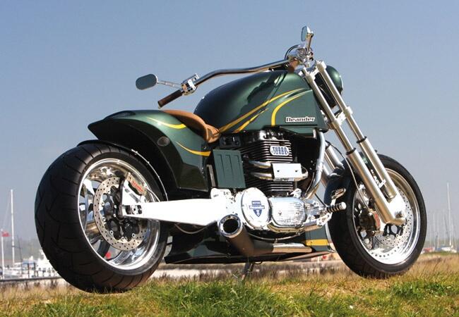 Un "mostro": 112 CV, 214 Nm di coppia, e una velocità massima di 220 km/h e un consumo medio di 4,5 litri per 100 km; valori che dovrebbero far sognare molti motociclisti, a patto che sopportino le mani sporche durante il rifornimento e le grandi nuvole di fumo nero in accelerazione, per non parlare del limitatore a 4500 giri (la coppia è ottenuta a 2600 giri e la potenza massima a 4200 giri)! Il motore è un originale bicilindrico in linea di 1340 cm3, raffreddato da aria e olio e dotato di turbo. Il cambio a sei marce è preso in prestito da un’Aprilia RSV 1000 R e la trasmissione finale è a cinghia. Per limitare le vibrazioni, Neander ha progettato questo motore con un doppio albero a gomito. Apprezzabili la gomma posteriore da 240 mm e l’interasse di ben 1740 mm.