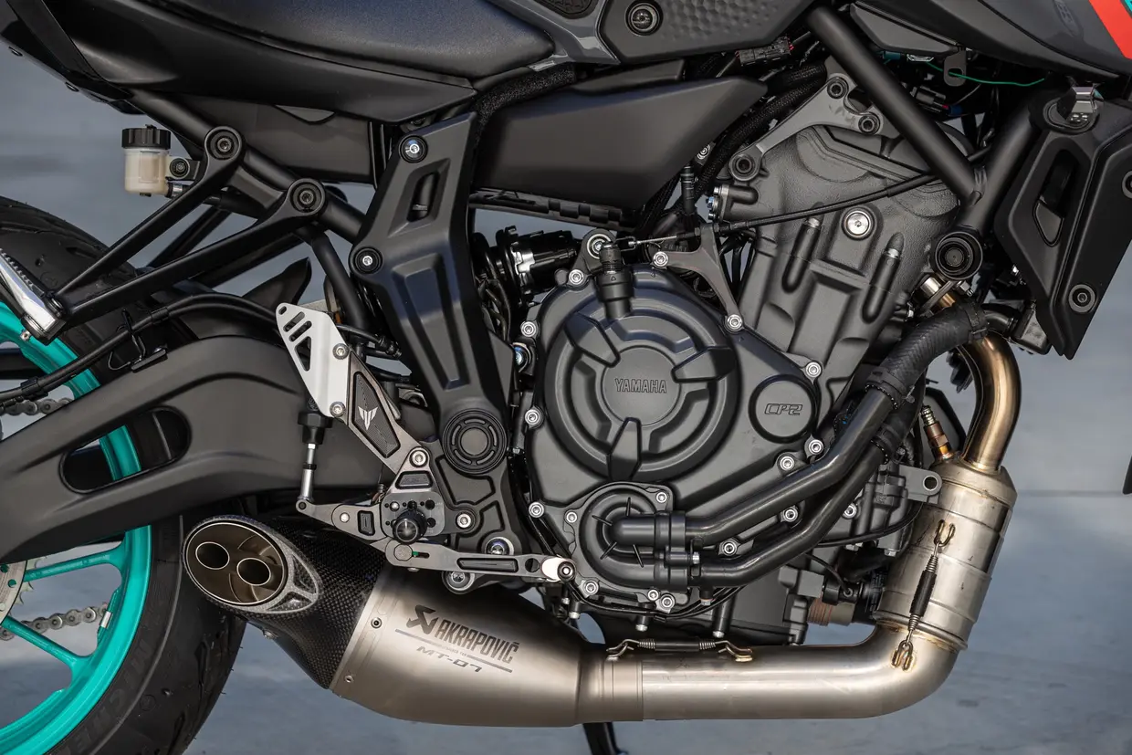 Lo scorso anno, nel 2025, con l'introduzione dell'Euro5+ è arrivata sul mercato la quarta generazione che conferma la solida e apprezzata base tecnica con motore CP2. I tecnici di Iwata hanno però aggiornato il progetto, dall'estetica alla tecnologia, senza tralasciare la ciclistica che aveva ancora bisogno di qualche affinamento. Primo tra tutti, la forcella: finalmente la MT-07 è dotata di un un'unità a steli rovesciati da 41 mm, più efficace e anche di pinze radiali a quattro pistoncini. Non cambia il motore bicilindrico frontemarcia da 689 cm3, che però, grazie al supporto di Yamaha Music, ha una cassa filtro che funge da amplificatore per esaltarne la tonalità.