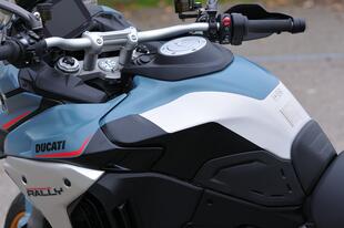 La V4 Rally ha una posizione di guida molto comoda: la sella è larga e ben imbottita e garantisce un ottimo confort anche dopo diverse ore in sella. Il serbatoio di 30 litri è piuttosto largo, ma grazie alla sagomatura corretta si riesce a stringere efficacemente fra le gambe. in più, le superfici laterali sono regolari, permettendo di avanzare senza intralci nella guida in piedi. Manubrio e pedane sono posizionati proprio dove si vorrebbe: si può viaggiare rilassati oppure aggredire le curve.