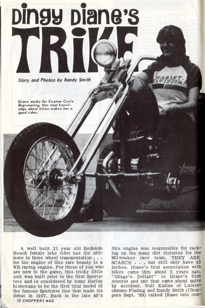 "Dingy Diane" posa con il suo trike tra le stesse pagine di Chopper Magazine (gennaio 1970)