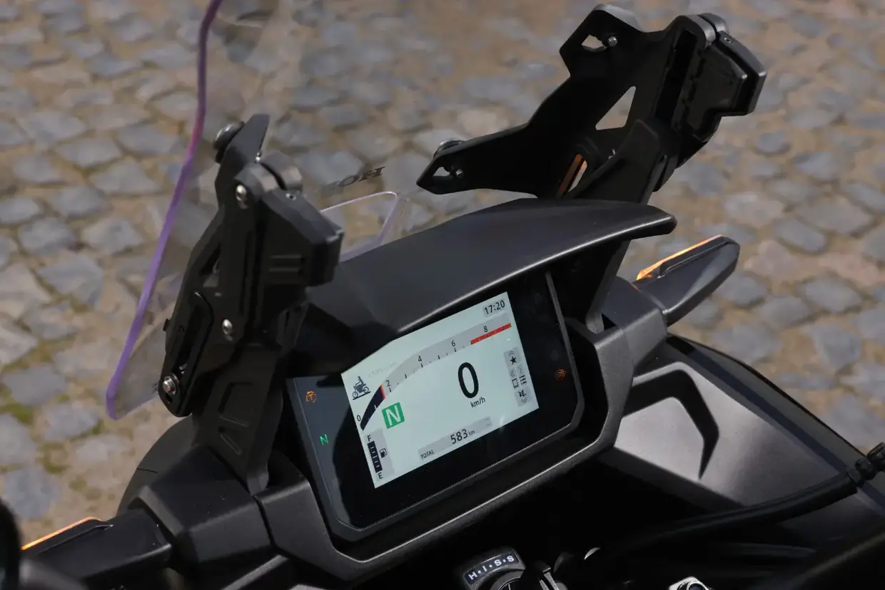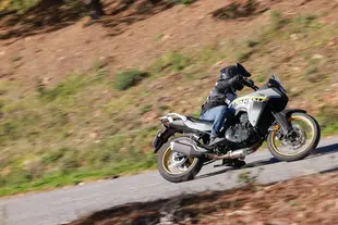 Con un peso a vuoto rilevato di 204 kg, l'impianto frenante con doppio disco anteriore da 310 mm garantisce spazi d'arresto più che adeguati. A 100 km/h, la Transalp si ferma in circa 38 metri, un dato in linea con gli standard della categoria.