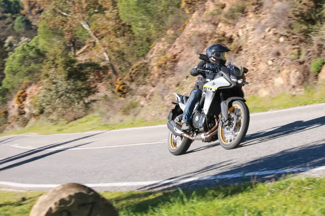 In ambiente urbano e su percorsi stradali la Transalp si comporta in modo eccellente. La posizione di guida comoda e rialzata, unita al manubrio largo, offre controllo ottimale e sicurezza. Il motore risponde con vigore a ogni regime, mentre le sospensioni digeriscono bene le sconnessioni del manto stradale. L'ABS risulta efficace senza essere invasivo, e i freni sono potenti ma facilmente modulabili. Il peso, pur non leggerissimo sulla carta, si sente poco in movimento rendendo facile la guida anche nel traffico cittadino. Tra le curve di montagna la Transalp sorprende per agilità e maneggevolezza, comportandosi come una stradale pura e non come una crossover.