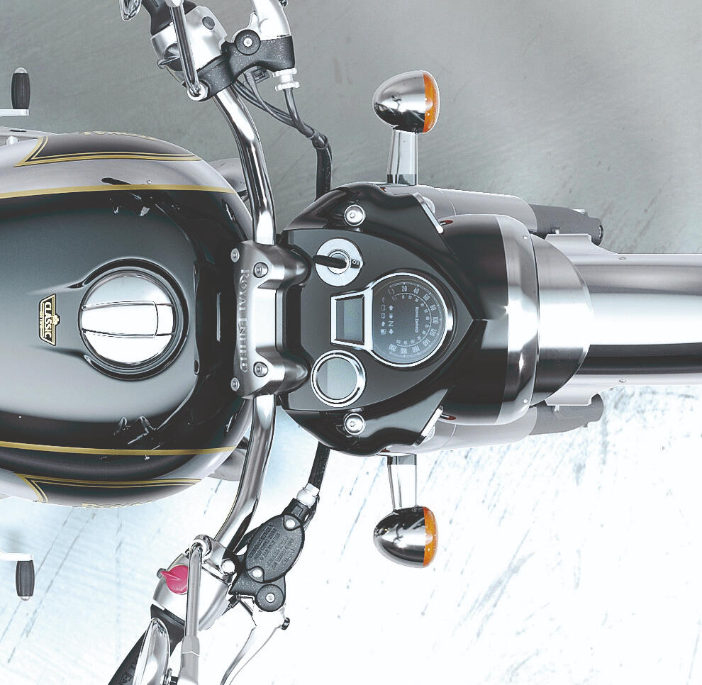 Nella gamma Royal Enfield, la Classic 650 (qui la nostra prova) rappresenta l’erede più fedele delle forme storiche: serbatoio a goccia, parafanghi avvolgenti, sella del pilota sospesa e tante cromature che richiamano la Bullet 500 twin del 1953. La base tecnica è condivisa con Shotgun e Super Meteor, a loro volta derivate dalla Interceptor. Il motore è il bicilindrico frontemarcia da 648 cm³, abbinato da una ciclistica tradizionale, quindi telaio a culla in acciaio, forcella Showa da 43 mm e due ammortizzatori posteriori regolabili nel precarico.