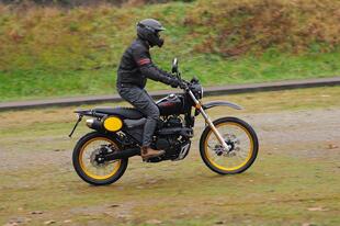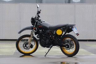 Il serbatoio a goccia domina il frontale, mentre le fiancate con le tabelle portanumero richiamano le scrambler classiche. Il faro piccolo è semplice ma funzionale, il manubrio largo con traversino garantisce una posizione di guida comoda e il silenziatore alto con forme da enduro completa il look da vera fuoristradista. La versione T si distingue per le ruote da 21" davanti e 18" dietro, calzate con pneumatici Nylon 90/90-21 e 130/70-18 dalla tassellatura vistosa, adatti a un utilizzo misto tra asfalto e sterrato. Il telaio è una monoculla sdoppiata chiusa in tubi tondi e quadri d'acciaio, soluzione classica che garantisce robustezza. Al posteriore un forcellone scatolato a sezione variabile è collegato a un singolo ammortizzatore da leveraggi progressivi, mentre all'anteriore troviamo una forcella convenzionale regolabile con steli da 43 mm di diametro. L'impianto frenante prevede un disco anteriore di 280 mm a margherita con pinza a quattro pistoncini e un disco posteriore da 240 mm, anch'esso a margherita. L'altezza della sella arriva a 90 cm da terra sulla versione T (tre cm più bassa la stradale) e la componentistica è di buona qualità per la fascia di prezzo.