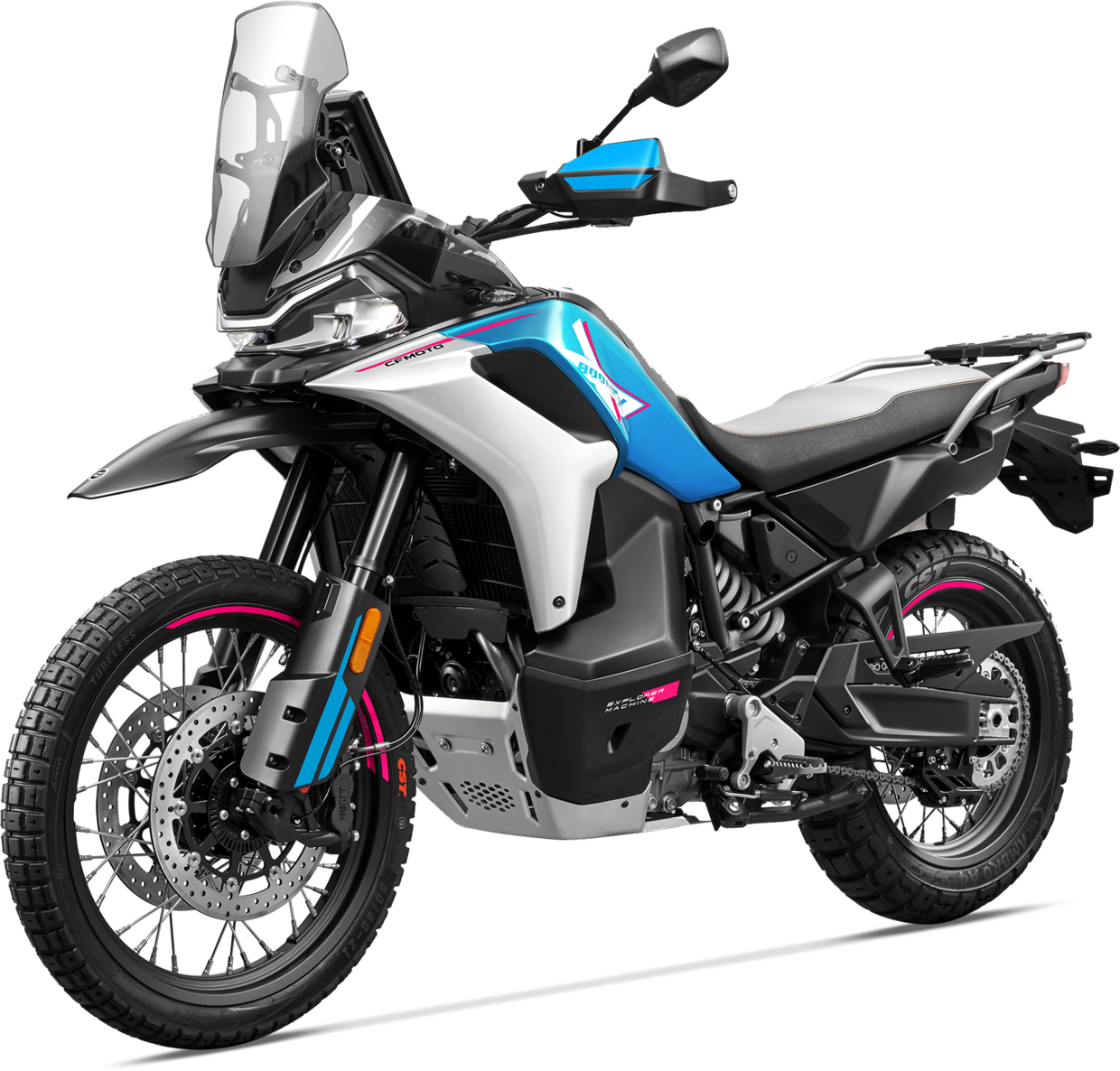 La CFmoto 800MT-X ha forme slanciate e componentistica da vera avventuriera. Di serie troviamo il parafango anteriore alto, il paramotore in alluminio, i paramani, il serbatoio da 22,5 litri e la sella piatta per muoversi agilmente in fuoristrada. La triangolazione sella-pedane-manubrio è stata infatti pensata anche e soprattutto per la guida in piedi, anche se non mancano dettagli in ottica comfort come il cupolino regolabile in altezza con una sola mano. Il motore bicilindrico frontemarcia è di origine austriaca: si tratta del LC8c di KTM da 799 cc che su questa moto cinese arriva a 91,2 CV di potenza a 8.250 giri/min. Il cambio elettronico bidirezionale è di serie. L'elettronica è completata da un cruscotto TFT a colori da 7" ad orientazione verticale che permette di gestire le tre mappe motore, l'intervento del controllo di trazione e dell'ABS, entrambi con funzionalità Cornering e disinseribili per la guida in off-road. Di qualità la ciclistica, che si basa su un telaio in acciaio e su un forcellone in alluminio: la forcella è a steli rovesciati da 48 mm e, come il monoammortizzatore, è completamente regolabile.
