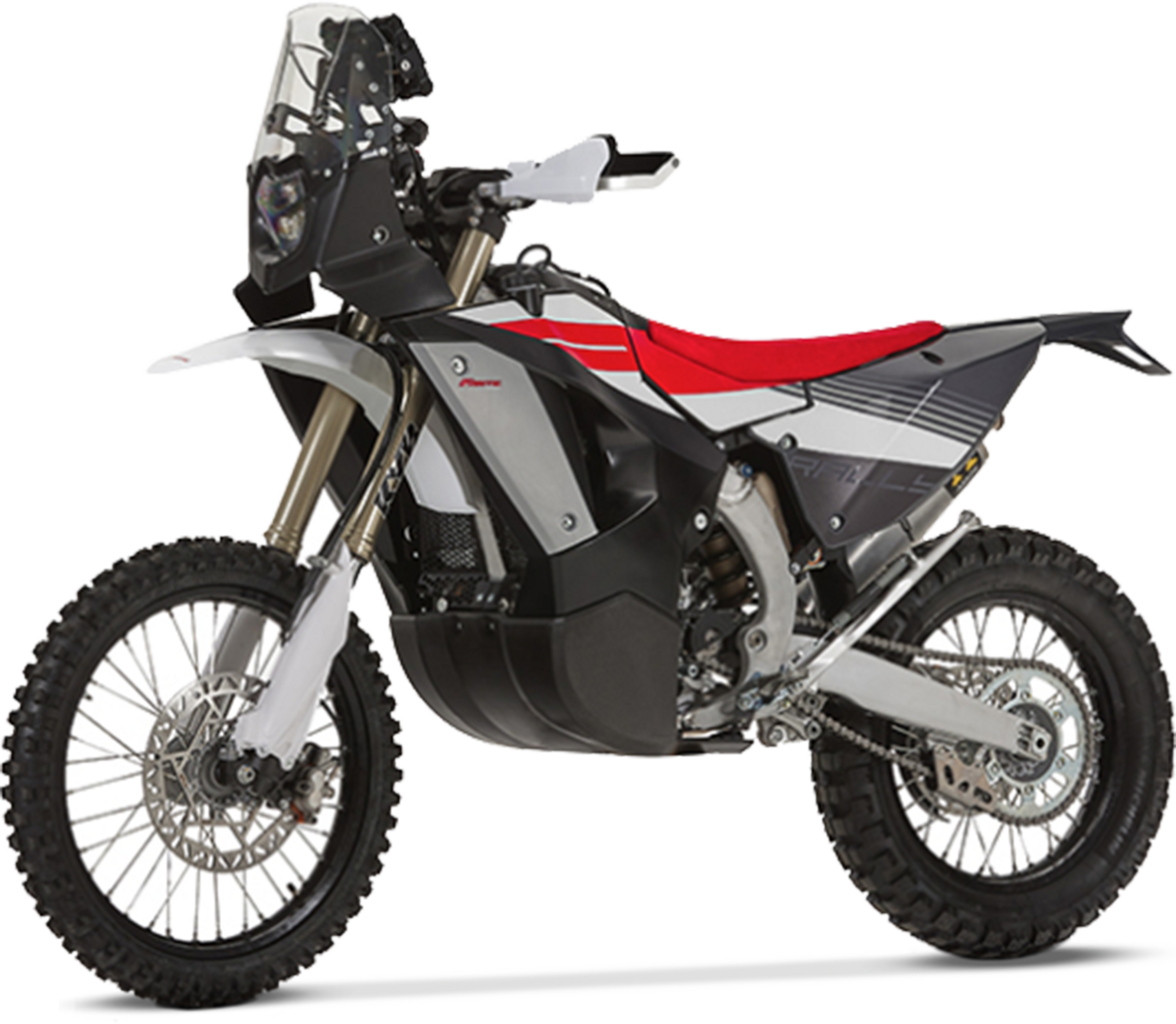 È una moto da rally "pronto gara" Il motore è il monocilindrico 450, cattivo quando serve, ma docile e sempre gestibile, abbinato a un raffinato telaio bitrave in alluminio e a sospensioni Kayaba. Le sovrastrutture e i serbatoi maggiorati sono progettati per offrire massima autonomia e una posizione di guida corretta: 30 lt sono distribuiti in due serbatoi (centrale e anteriore-laterale). Completissima anche la strumentazione: grazie al RallyScreen da 7 pollici, tutti i parametri della moto sono sempre sotto controllo ed è possibile consultare facilmente tracce GPX, roadbook digitali e usare tutte le app di navigazione presenti sul mercato, sia dal touchscreen che attraverso i due controller a manubrio. Completa la dotazione tecnica un freno anteriore maggiorato da 300mm e l’ampio cupolino in plaxiglass.