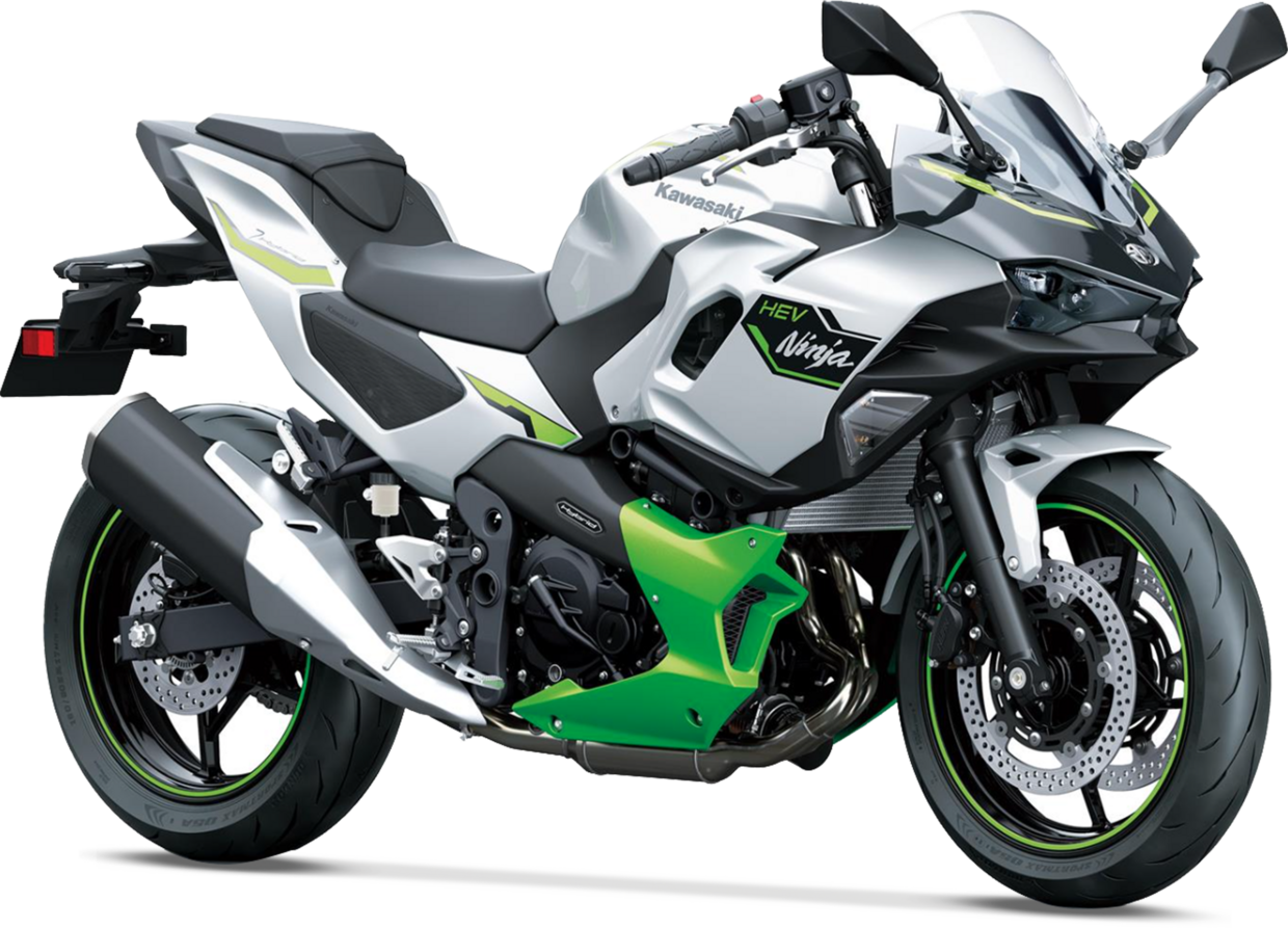 È una sportiva speciale, infatti il motore bicilindrico è accoppiato a una unità elettrica che può anche sostituirlo per una decina di km circa, mentre la batteria si ricarica quando il motore supera i 3.000 giri e in frenata. Tre le modalità di guida: Sport-Hybri con tutti i CV a disposizione, Eco-Hybrid con il motore termico a potenza limitata e full elettric. Piccola nota per la funzione e-boost: basta pigiare il tasto e il motore elettrico, regala per 5 secondi una decina di CV in più, perfetti per fare sorpassi in un attimo. Il cambio non richiede l’uso di frizione e può essere azionato manualmente tramite due tasti sul blocchetto sinistro, oppure funzionare in automatico. Con questa modalità però sale immediatamente di marcia per risparmiare benzina, anche se alle volte sarebbe necessario scalare. Dal punto di vista della ciclistica abbiamo un classico telaio a traliccio, forcella non regolabile con steli da 41 mm e un mono posteriore regolabile nel precarico. La posizione di guida è buona, i semimanubri sono rialzati, la sella bene imbottita e le pedane non troppo raccolte. A frenare la Ninja ci pensa un doppio disco da 300 mm su cui agiscono pinze Nissin ad attacco radiale. Il peso elevato si sente solo nelle manovre, mentre una volta in movimento, la Z7 si rivela maneggevole e rapida nello scendere in piega.