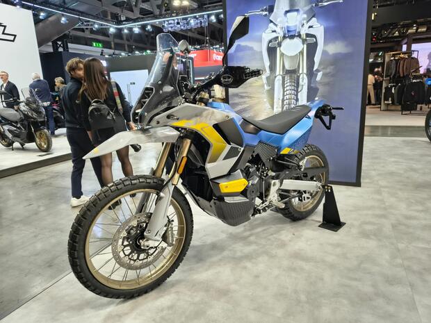 C’è la mano del designer Rodolfo Frascoli dietro la Mud e si vede: la linea è personalissima e molto gradevole per una moto in equilibrio tra l’uso su asfalto e il fuoristrada, il cupolino alto offre una buona protezione aerodinamica e la sella liscia permette gli spostamenti. Il reparto sospensioni è costituito da un forcellone a due bracci con unico ammortizzatore e una forcella a steli rovesciati di 43 mm. Come si conviene a una moto dall’impostazione fuoristradistica le ruote sono a raggi, l’anteriore di 21 “e la posteriore di 18”, mentre il motore è un bicilindrico a quattro tempi con raffreddamento a liquido, distribuzione a doppio albero a camme in testa e quattro valvole per cilindro.