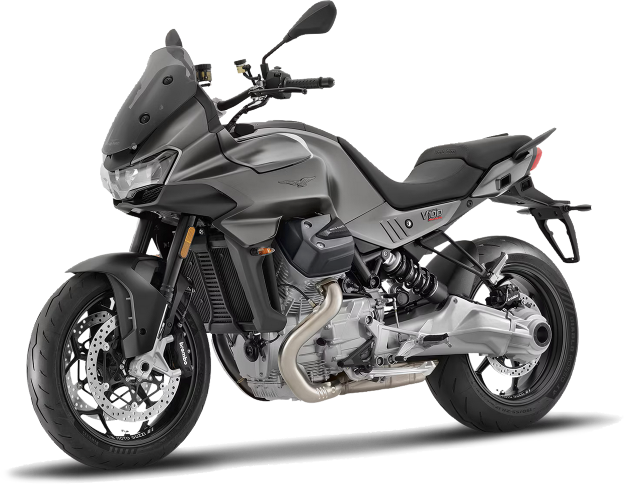 La V100 Mandello sfoggia soluzioni tecniche raffinate, oltre al compatto bicilindrico raffreddato a liquido con trasmissione finale a cardano, ci sono i deflettori ai lati del serbatoio che si aprono automaticamente, migliorando la protezione dall'aria del pilota. L'elettronica sfoggia 4 Riding Mode, controllo di trazione e ABS con funzione cornering, cruise control e strumentazione TFT a colori da 5 pollici. Esclusivi invece per la versione S le sospensioni a regolazione elettronica e il cambio quickshif bidirezionale (non sempre preciso). Tra le curve la V 100 è a proprio agio, la ciclistica a punto la rende reattiva nello scendere in piega anche se nello stretto i 233 kg di peso si fanno sentire. Davvero efficaci le sospensioni a regolazione elettronica (solo per la S) che, in base al riding mode selezionato, offrono sempre il giusto supporto alla guida. Inappuntabile la frenata.