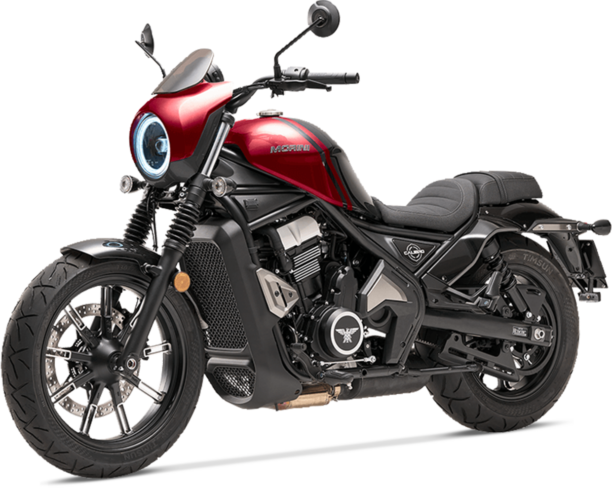 È una custom di cilindrata media, adatta anche a chi non ha molta esperienza. Monta un motore bicilindrico frontemarcia raffreddato a liquido inserito in una ciclistica classica: telaio in tubi di acciaio, forcella di tipo tradizionale, due ammortizzatori posteriori e cerchi in lega (da 18” anteriore e 16” posteriore). L’impianto frenante è a doppio disco (da 320 e 255 mm), quello posteriore si rivela potente e pronto, quello anteriore invece richiede una certa decisione sulla leva. La trasmissione finale è a cinghia come nelle grandi custom americane, da cui riprende anche la posizione di guida: busto eretto, piedi avanzati e braccia larghe a impugnare il manubrio. Il comfort è buono anche dopo ore in sella, nonostante l’assenza di qualsiasi protezione. Il motore ha una spinta vigorosa, mentre il cambio non è sempre preciso. La ciclistica è ben bilanciata, la Calibro scende in piega tranquilla e segue con sicurezza la traiettoria impostata.