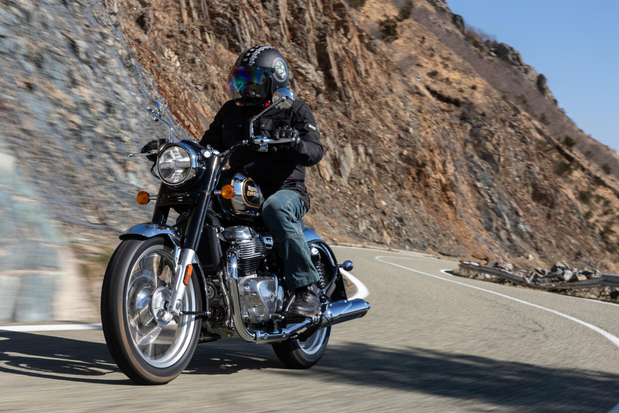 Il design richiama elementi distintivi del passato, come il serbatoio a goccia, i fari tondi e i parafanghi dalle forme generose, mentre il cuore è l'apprezzato motore bicilindrico parallelo della casa indiana. La strumentazione è formata da uno strumento a lancetta con un piccolo pannello LCD con le informazioni essenziali, mentre sulla destra troviamo anche il piccolo display circolare del navigatore. Di serie ci sono il cavalletto centrale e quello laterale, oltre a una presa USB-C accanto la leva della frizione. I freni vedono un singolo disco da 320 mm con pinza a doppio pistoncino ByBre all'anteriore e un generoso disco da 300 mm al posteriore con pinza a doppio pistoncino parallelo dietro, tenuti a bada però da un ABS un po' invasivo. Piace la posizione di guida comoda e abbastanza eretta, con spazio abbondante per il pilota, in movimento la Classic si guida con facilità, tra le curve è precisa e bilanciata a patto di non esagerare, perché non è certo una sportiva. Il motore sfodera un tiro costante e privo di buchi lungo tutto l'arco di erogazione, l'ABS invece è un po’ invasivo.